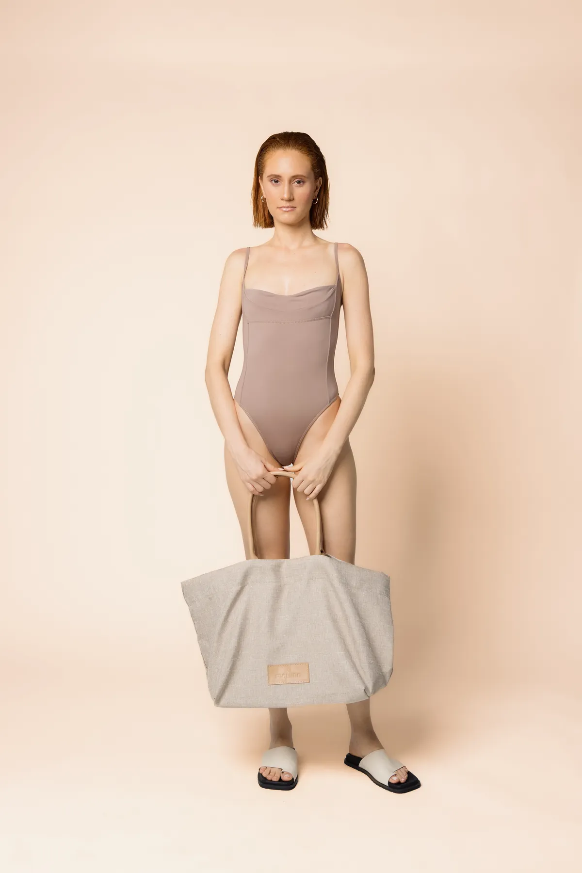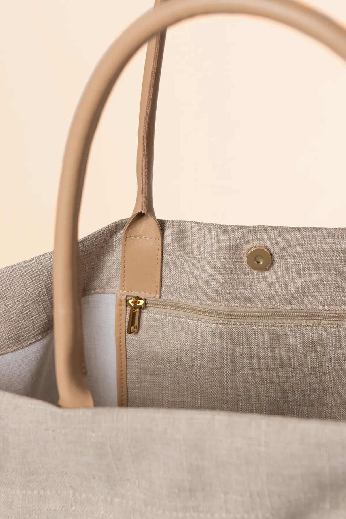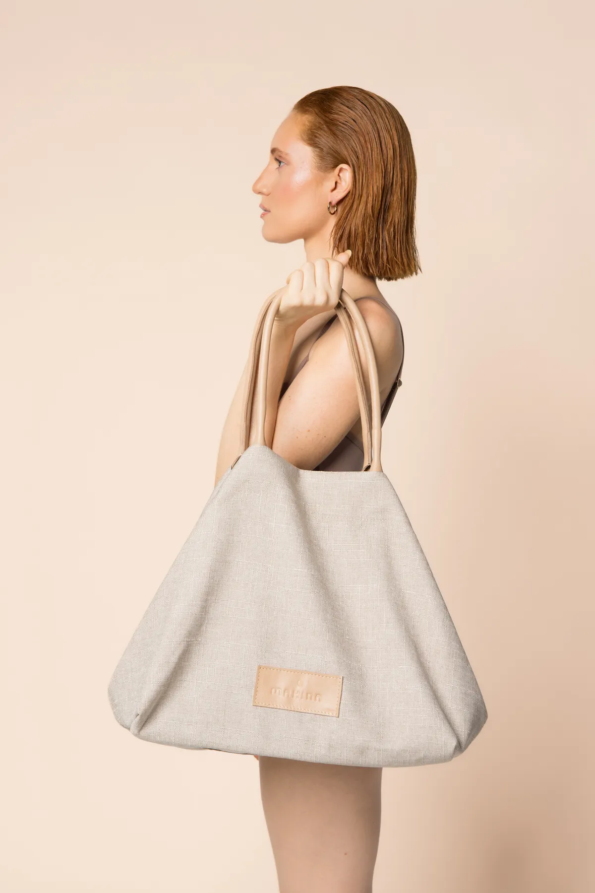 Bolsa grande em linho e alças em couro, com bolso interno de zíper. Possui uma base rígida para estruturar a bolsa, que também pode ser removida.