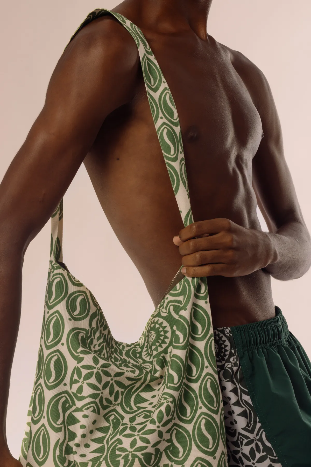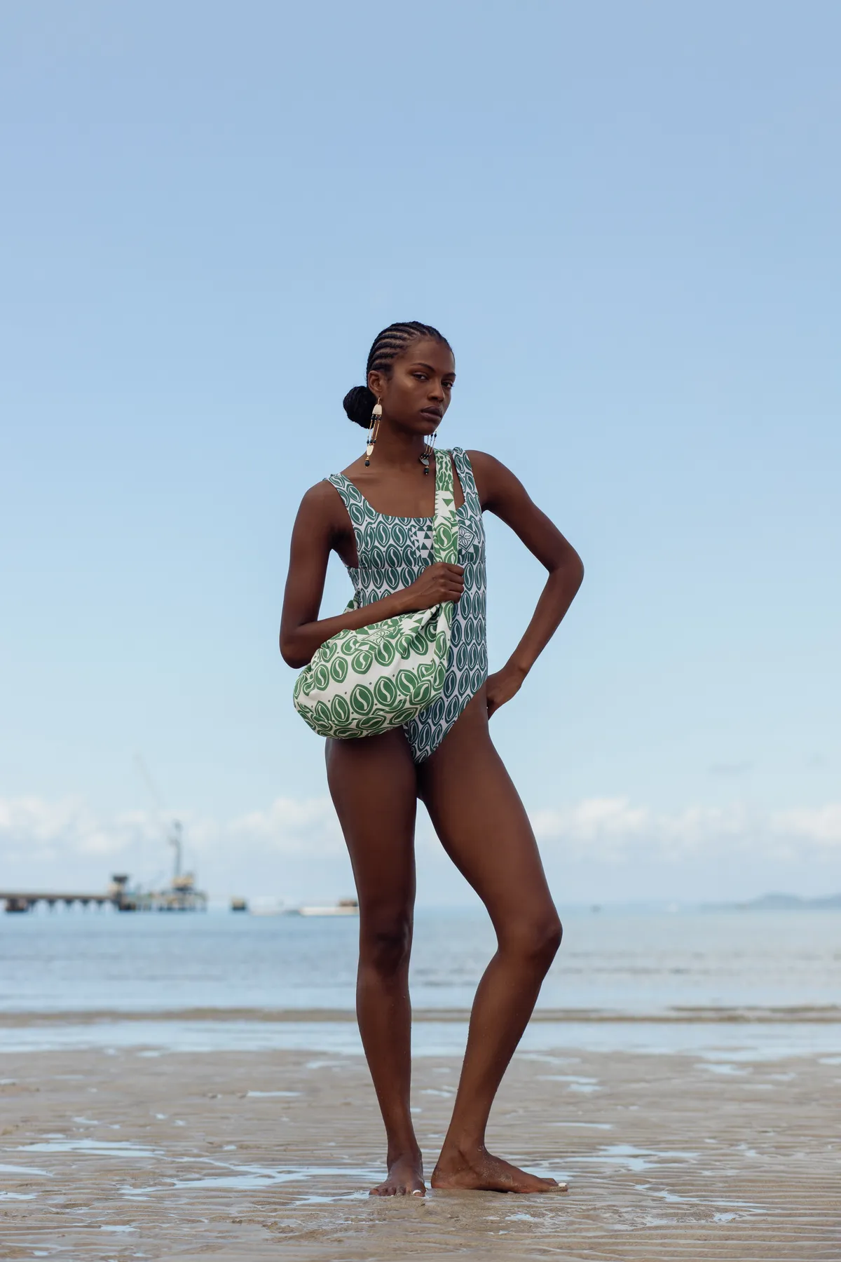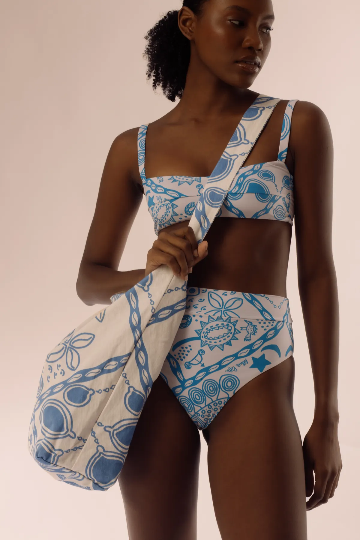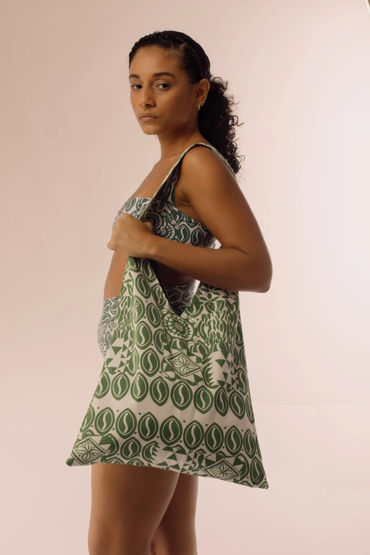 Bolsa grande em linho e alças em couro, com bolso interno de zíper. Possui uma base rígida para estruturar a bolsa, que também pode ser removida.