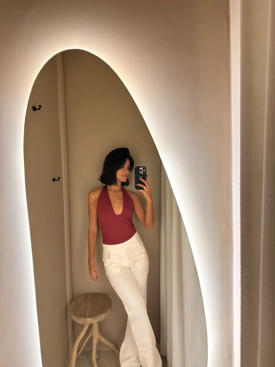 O Top Olga possui drapeado nas laterais, proporcionando um visual único a peça. Possui amarração no pescoço com alças largas que conferem sustentação e conforto. Comprimento médio, sendo uma peça versátil, para além mar. Conta com abertura na parte interna da peça, para adicionar bojo.