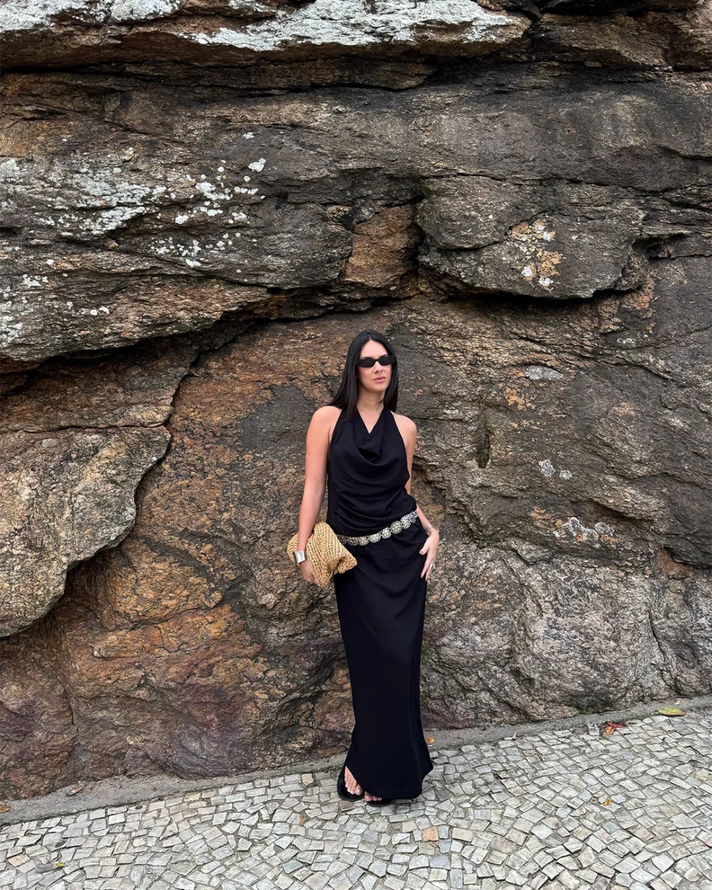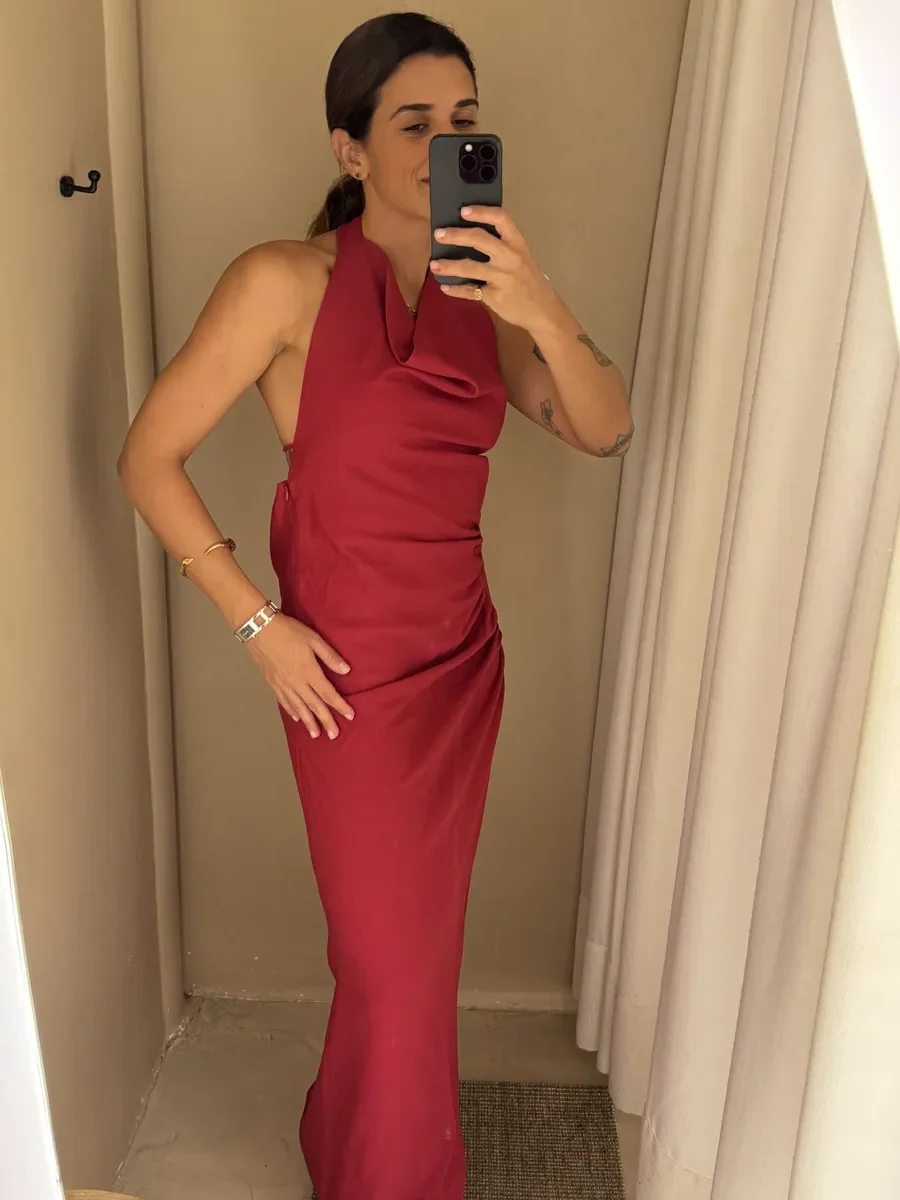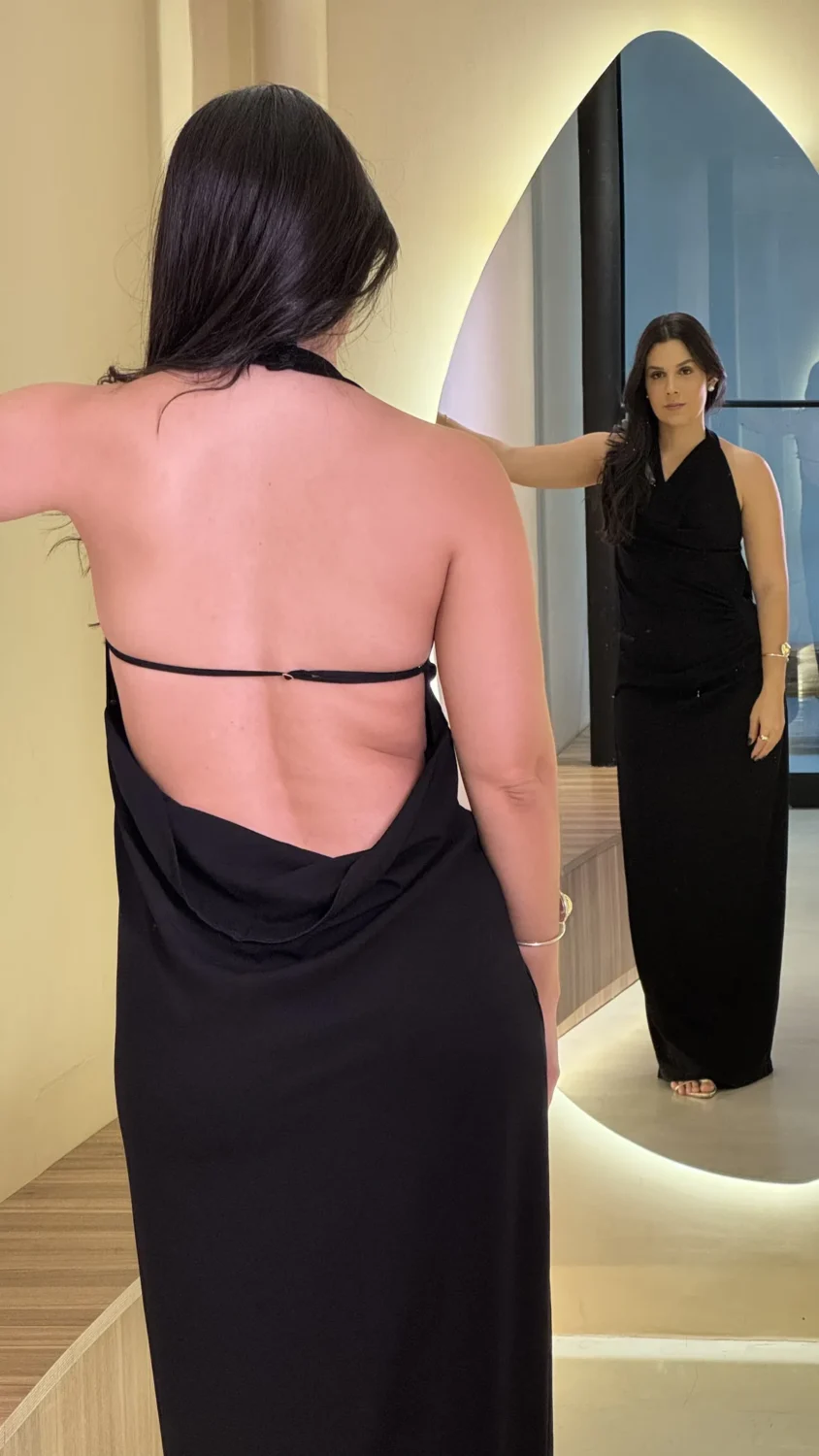 O Vestido Antônia possui um drapeado e decote degage na frente, e de forma ampla nas costas, unindo modernidade e sofisticação. Possui regulador nas costas e fechamento em botão na parte de trás do pescoço.