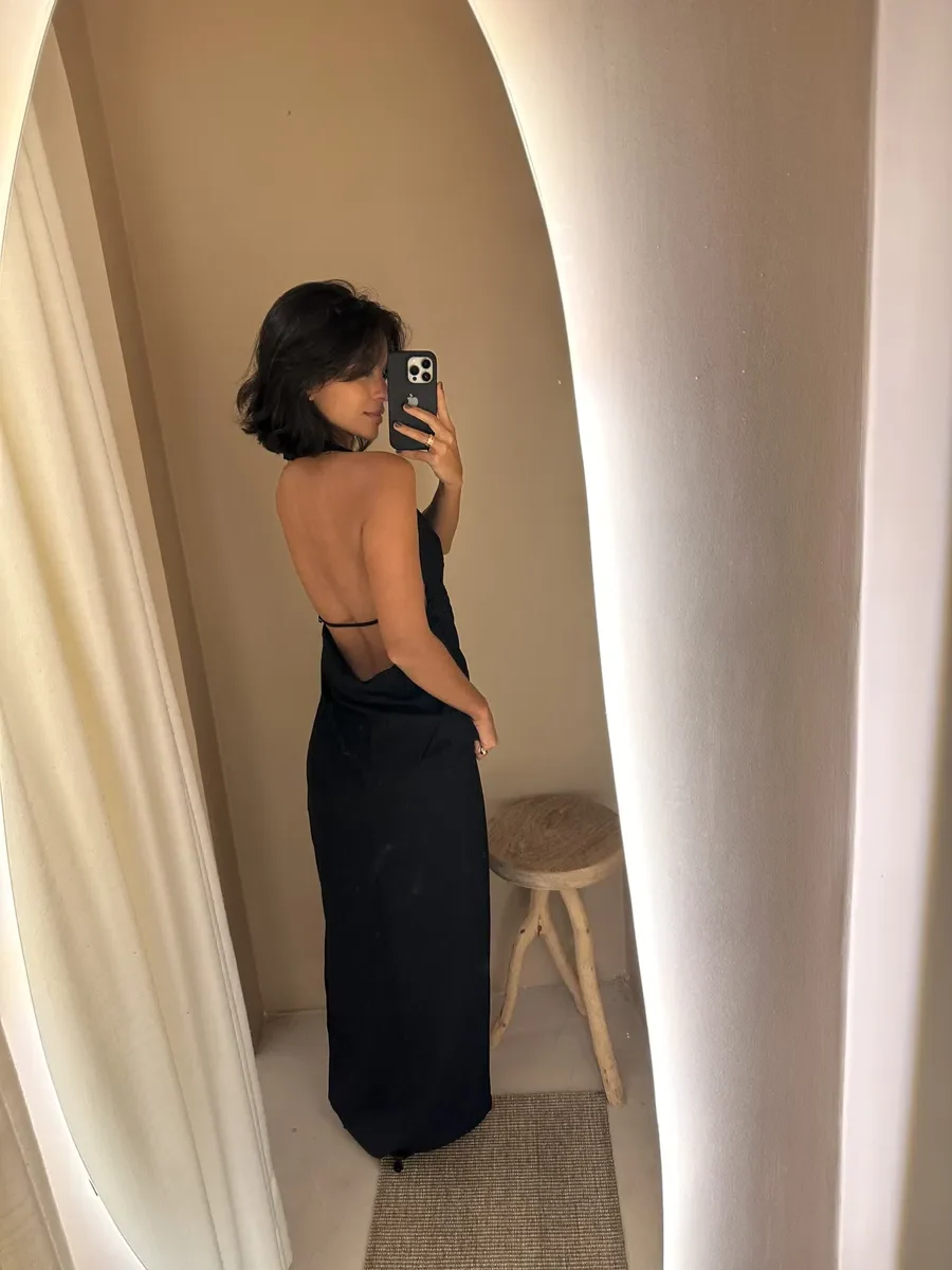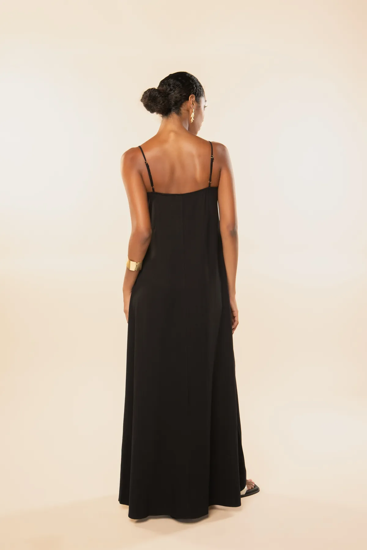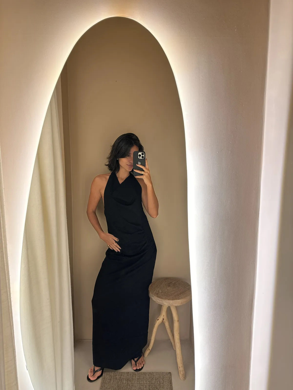 O Vestido Antônia possui um drapeado e decote degage na frente, e de forma ampla nas costas, unindo modernidade e sofisticação. Possui regulador nas costas e fechamento em botão na parte de trás do pescoço.